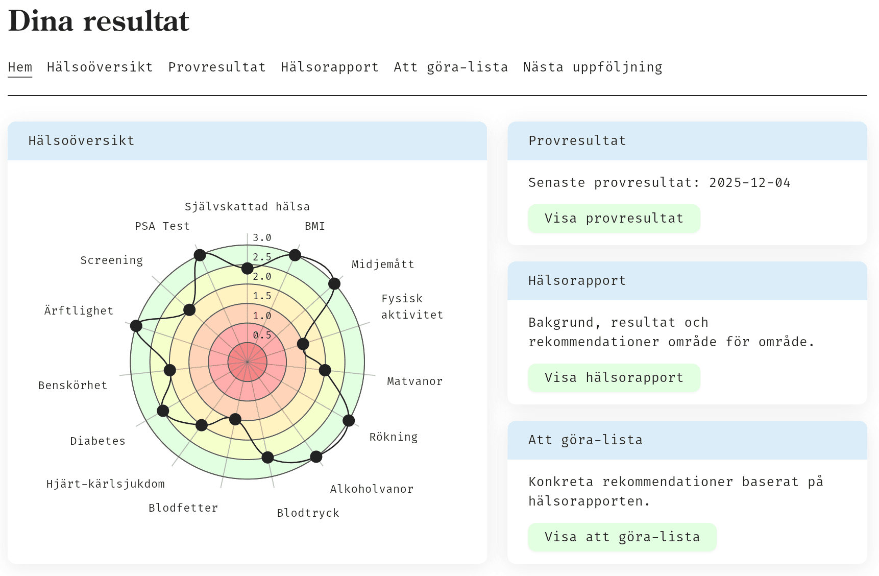 - Att du följt nationella screeningprogram (bröstcancer, tjocktarmscancer, livmoderhalscancer, bråck på kroppspulsådern)